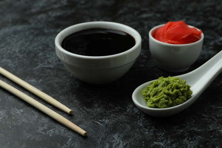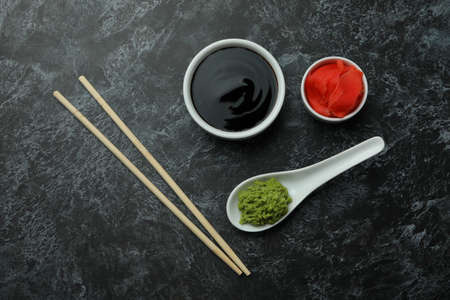 Hot wasabi paste, soy sauce and ginger on dark textured table, flat lay