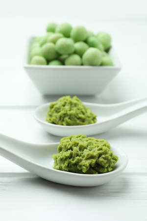 Word Wasabi made of wasabi and spoon with wasabi isolated on white background