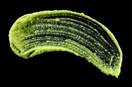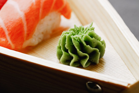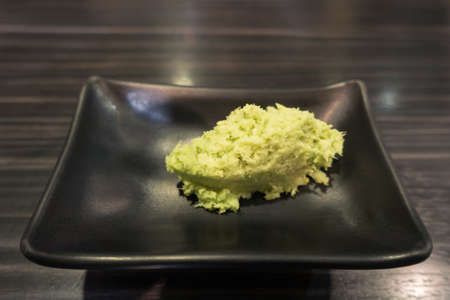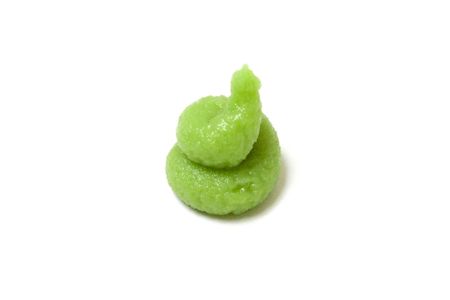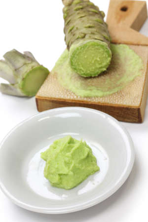 Wasabi, a pungent green Japanese condiment made from the root of the herb Eutrema wasabi