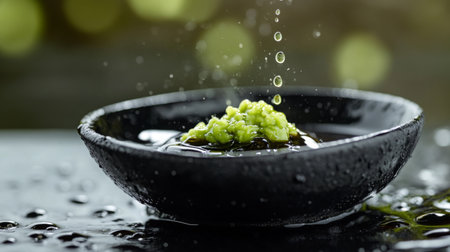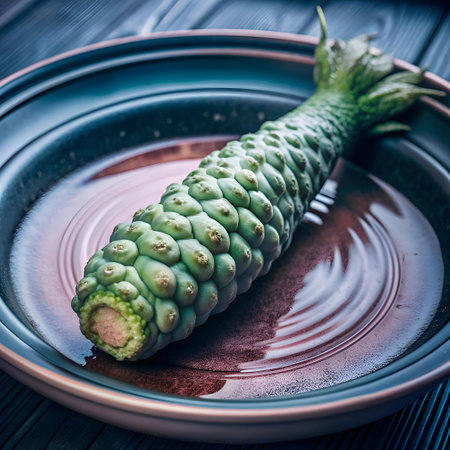 A close-up image of fresh wasabi atop a black plate, surrounded by water droplets, showcasing its vibrant color and elegant presentation for culinary inspiration.