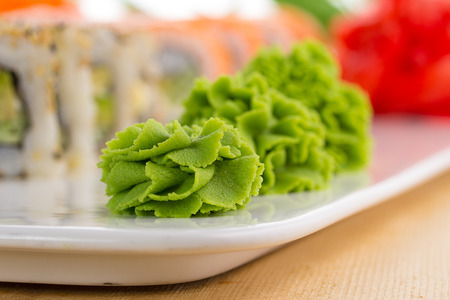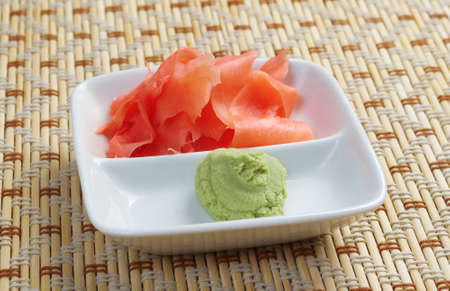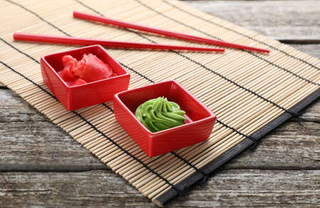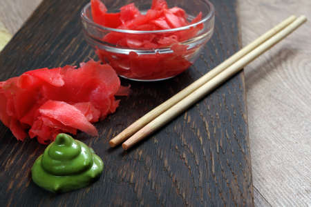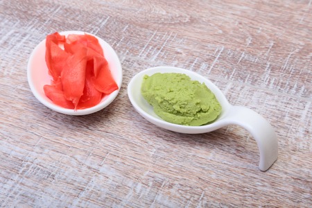traditional spices for sushi. wasabi and pickled ginger on a wooden table