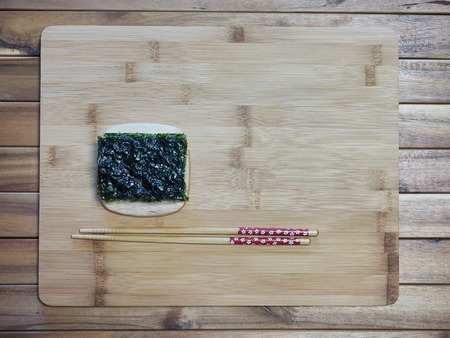 Chopped seaweed sheets, bowl with soy sauce and chopsticks on yellow background