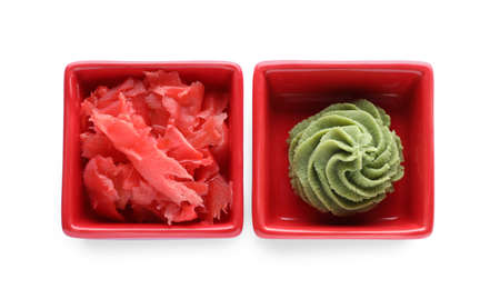 Bowls with swirl of wasabi paste and pickled ginger on white background, top view