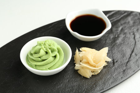 Slate board with hot wasabi paste, soy sauce and ginger on light textured table, closeup