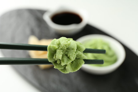 Chopsticks with hot wasabi paste on blurred background, closeup