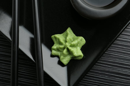 Plate with hot wasabi paste and chopsticks on black textured table, closeup