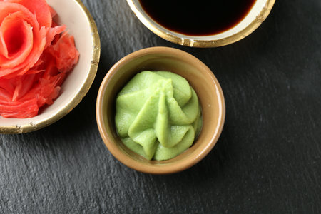 traditional Japanese condiments, composition of wasabi, ginger and soy sauce for sushi with copy space background