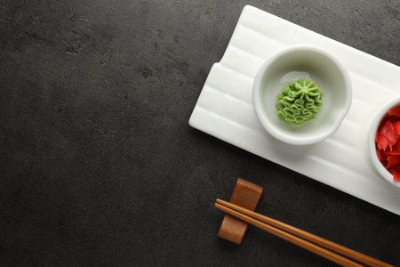 Hot wasabi paste, ginger and chopsticks on black textured table, top view. Space for text