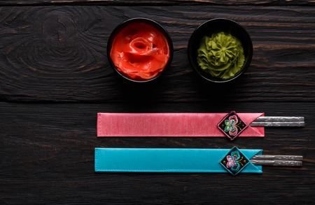 Pieces of traditional japanese tablewear. Chopsticks in blue and pink cases, small black bowls with ginger and wasabi on dark wooden table. Top view, flat lay, copy space, background