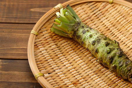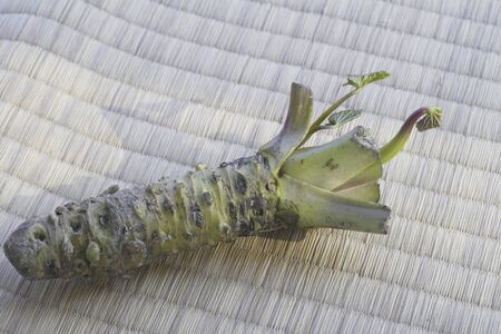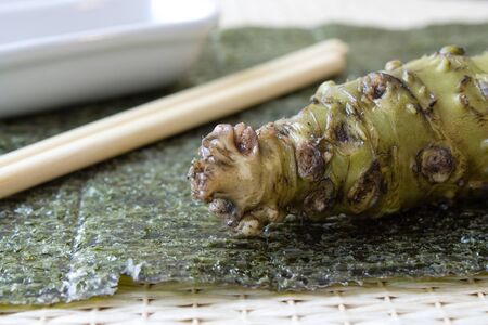 Selective focus image of fresh wasabi root also called Japanese horseradish on seaweed