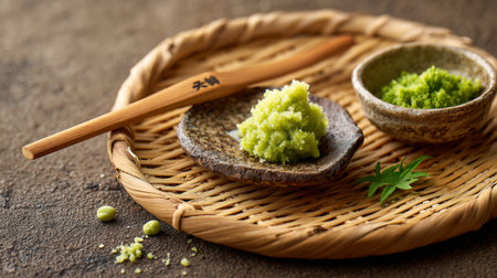 Vibrant fresh wasabi paste elegantly arranged on rustic dish with bamboo chopsticks. Ideal for culinary presentations, this image captures the essence of authentic Japanese cuisine.
