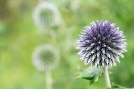 Purple flowering thistle (Carduus) in nature. Blooming plant. Copy space