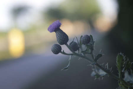 beautiful purple thistle flower blooms in the meadow, narrow focus area, contour light