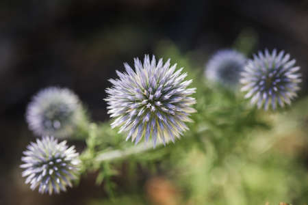 Close-up of an isolated purple inflorescence of globularia on an unfocused background