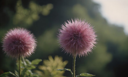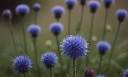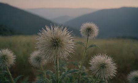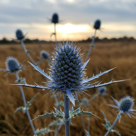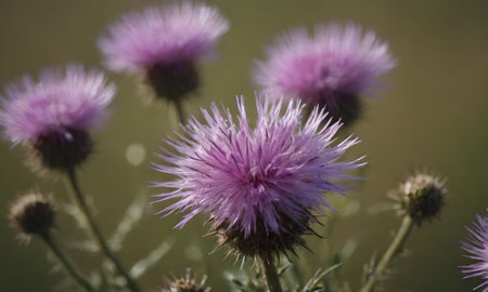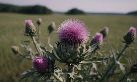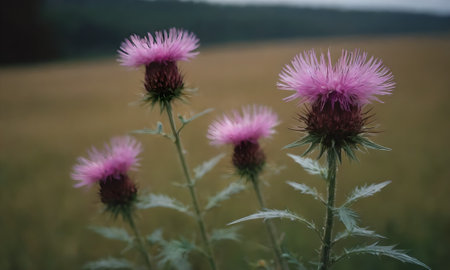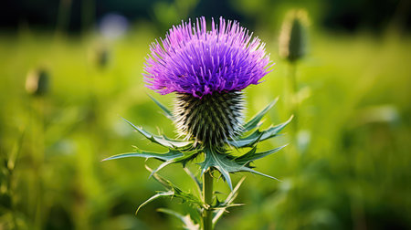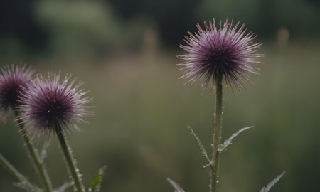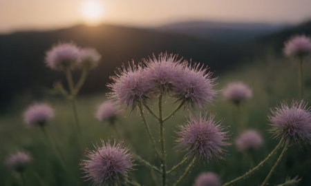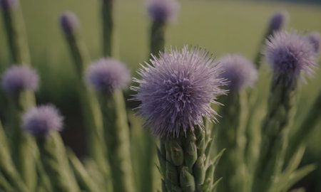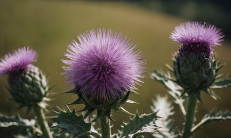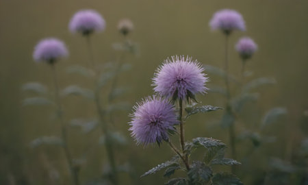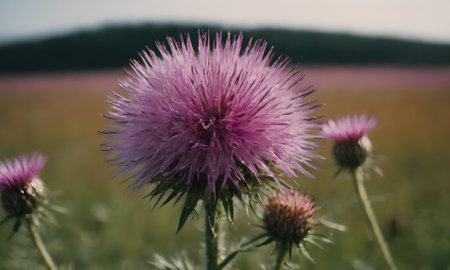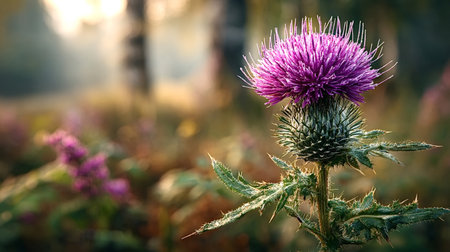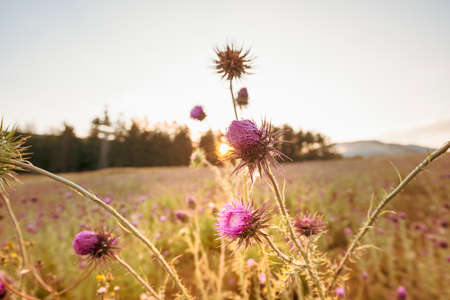Purple thistle flower head blooming in a field during sunrise, showcasing its delicate beauty and prickly nature in the soft morning light with other thistle flowers blurred in the background