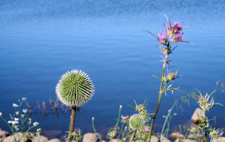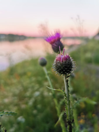 Large thistle inflorescences. Thistle (lat. Carduus) is a genus of plants in the family Compositae, or Compositae. Early morning on the lake.