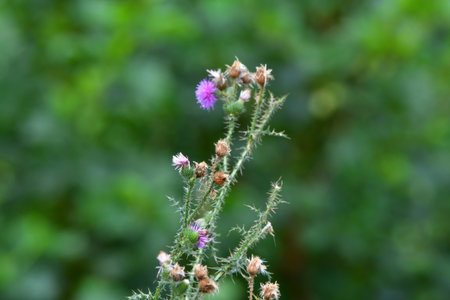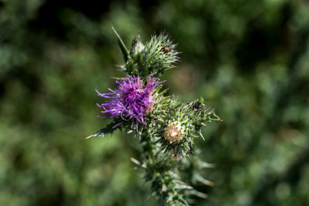 Carduus nutans. Bright purple prickly inflorescence of a weed plant on a blurred green background. Close-up