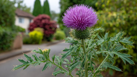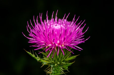 Purple thistle flower blooming, showing spiky leaves in a botanical close-up