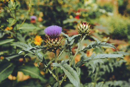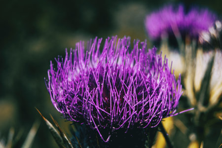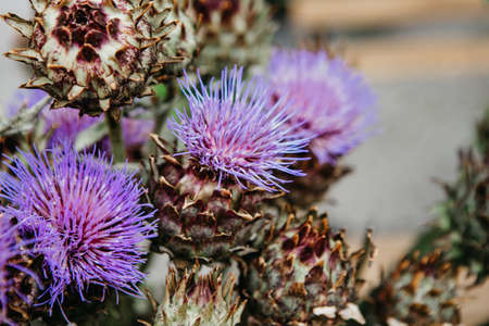 Cardoon, cynara cardunculus or artichoke thistle. Violet cardone for design fashion bouquet in flower shop, close up, free space