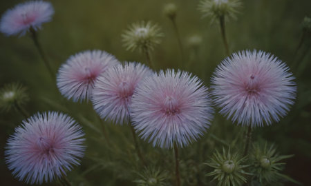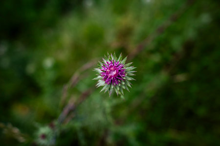 Minimalist macro of Carduus nigrescens bud with purple petals and green spines, isolated on blurred background. Concept of wild flora, resilience, strength and natural design.