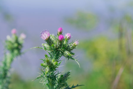 Wild herb of Thistle or Silybum marianum or Burdock. Herbal Thistle Burdock plant, used in medicine and as symbol of Scotland. Plant is rich in minerals and vitamin K. Selective focus