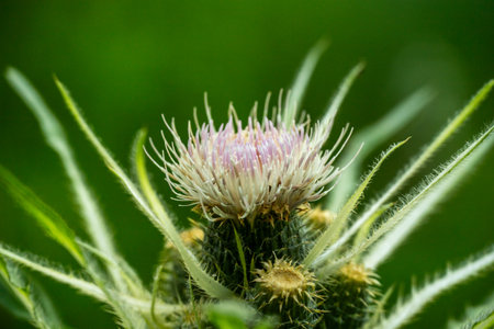 beautiful bright Thistle flower, plants with the Latin name Carduus on a green natural background, narrow focus area