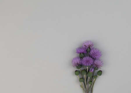Minimalist composition Floral pattern of purple milk thistle flowers spikes on gray background. Flat lay, top view.