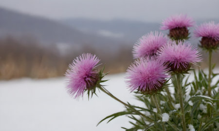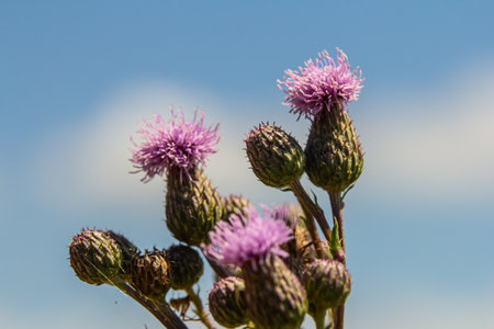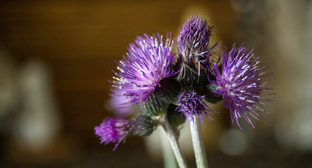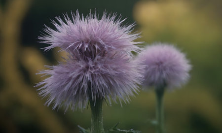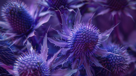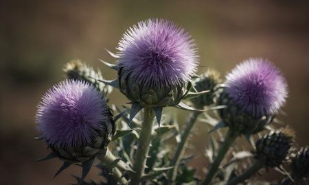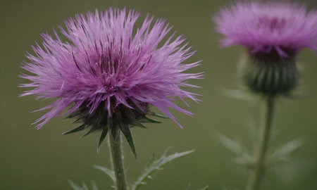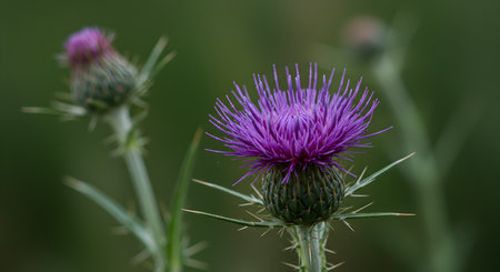 Close-up captures vibrant purple thistle flowers, showcasing their intricate details against a soft, blurred background, perfect for spring or botanical themes.