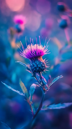 Eye-level, the image highlights a richly colored purple thistle, its spiky leaves and bloom sharply in focus, set against a soft backdrop with bokeh circles in pink.