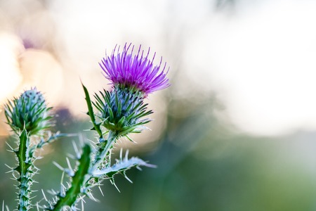 Milk thistle flower opening in a golden sunset.defocused background Copy space.