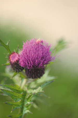 Beautiful purple thistle flower in the meadow. Soft focus.
