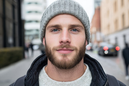 Bearded man in thoughtful pose against vibrant flag backdrop, displaying ocean blue eyes and winter outdoor attire.