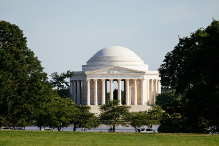 Jefferson Memorial framed by trees on a sunny day in Washington DC, USA, iconic neoclassical landmark. g.