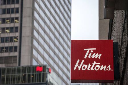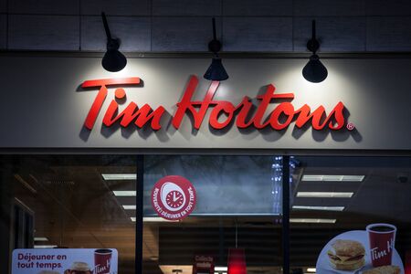 MONTREAL, CANADA - NOVEMBER 6, 2018: Tim Hortons logo in front of one of their restaurants in Montreal, Quebec. Tim Hortons is a cafe and fastfood canadian brand