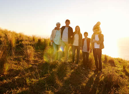 Theyre happiest when theyre all together. A portrait of a happy family standing on a grassy hill at sunset.