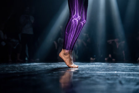 A dancer balances on bare toes on a dark reflective stage while a glowing purple digital skeleton overlay reveals the internal bone structure and knee joints under dramatic spotlights.