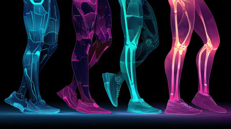 Futuristic robotic legs in various poses highlight intricate designs and glowing elements. The scene features a dark background emphasizing the vibrant colors.