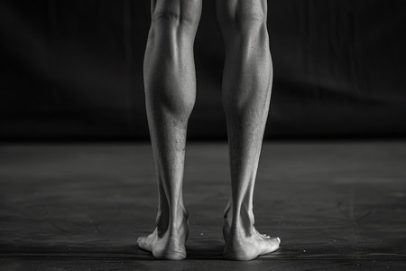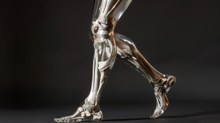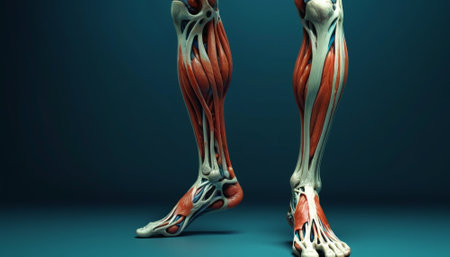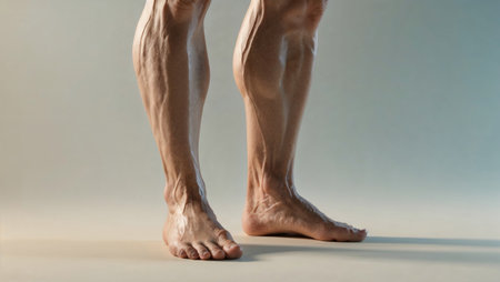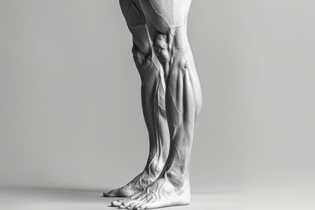 A pair of legs with muscles and tendons visible. The legs are shown in a close-up view, with the feet and ankles clearly visible. Concept of realism and detail