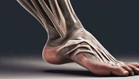 A close-up of a human foot, showcasing the bones, joints, and muscles that enable movement and support in the lower extremities.
