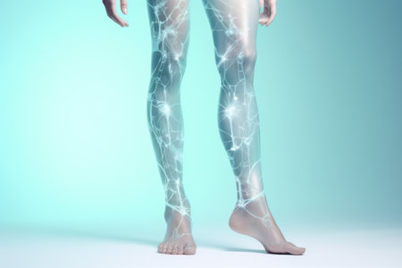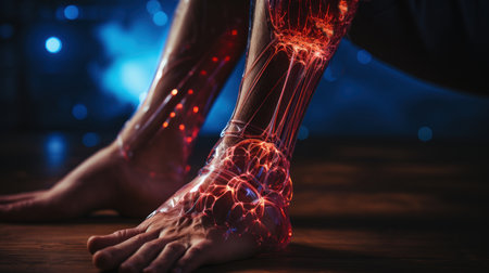 This futuristic digital illustration showcases detailed foot anatomy with neon lines and nodes, symbolizing biological connectivity and innovation in health technology.