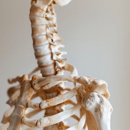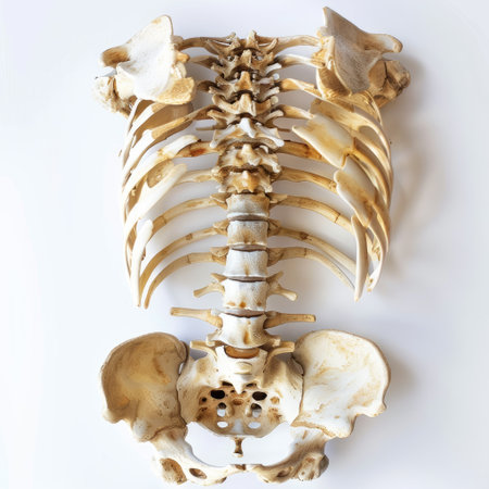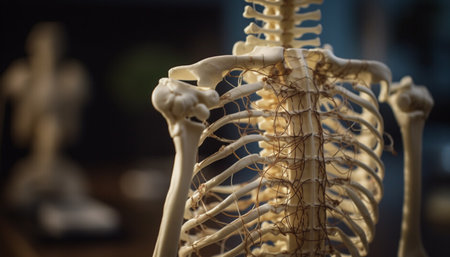 Close-up view of a human skeletal model showcasing the spine and ribcage. Ideal for educational purposes, this image highlights important anatomical details for biology and health studies.