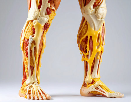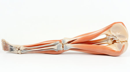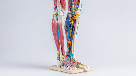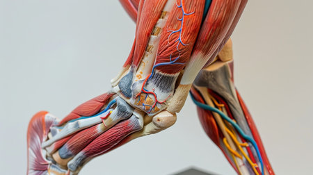 Detailed anatomical model showcasing the muscles, bones, and tendons of the human leg, providing a clear view of the internal structure.