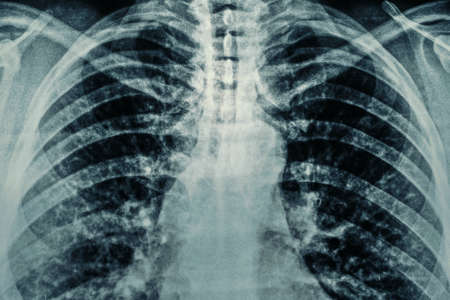 Macro photo of Radiological chest x-ray film with film grain. Asthma, COVID-19, coronavirus or pneumonia diagnostic concept.