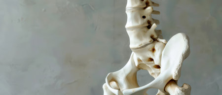 A white, plastic model of the human pelvis and spine stands against a grey wall. The model's bones are detailed, and the curved spine is positioned vertically, with the pelvis positioned below.