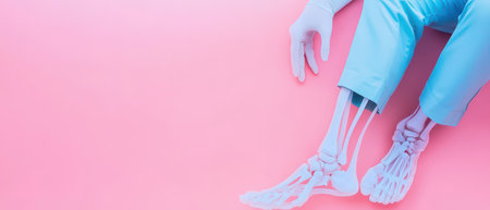 A plastic skeleton model is positioned on a pink background. The skeleton shows detailed leg anatomy including bones and joints.