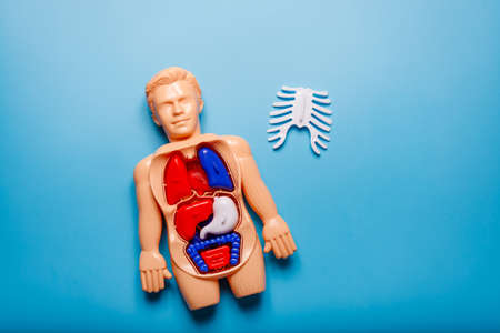 Human body Montessori toy on blue background. Concept of learning human anatomy with body system by using friendly materials for kids.