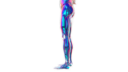 Detailed rendering of leg muscle anatomy reveals intricate structures including tendons, arteries, and nerves in a flat medical style illustration.