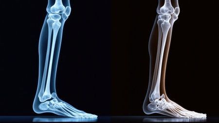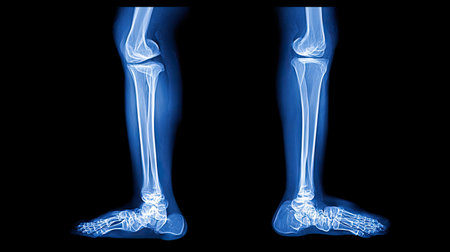This X-ray image provides a clear view of the human lower leg, showcasing the intricate structures of the ankle and knee joints for medical analysis.
