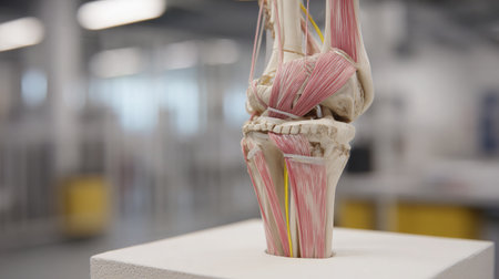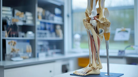 A detailed anatomical model of the human leg in a bright and organized laboratory, highlighting key structures for educational and training purposes.