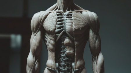 A high-resolution shot of a human torso showing the anatomical structure, including well-defined abs and ribcage, emphasizing the bodys form and fitness.